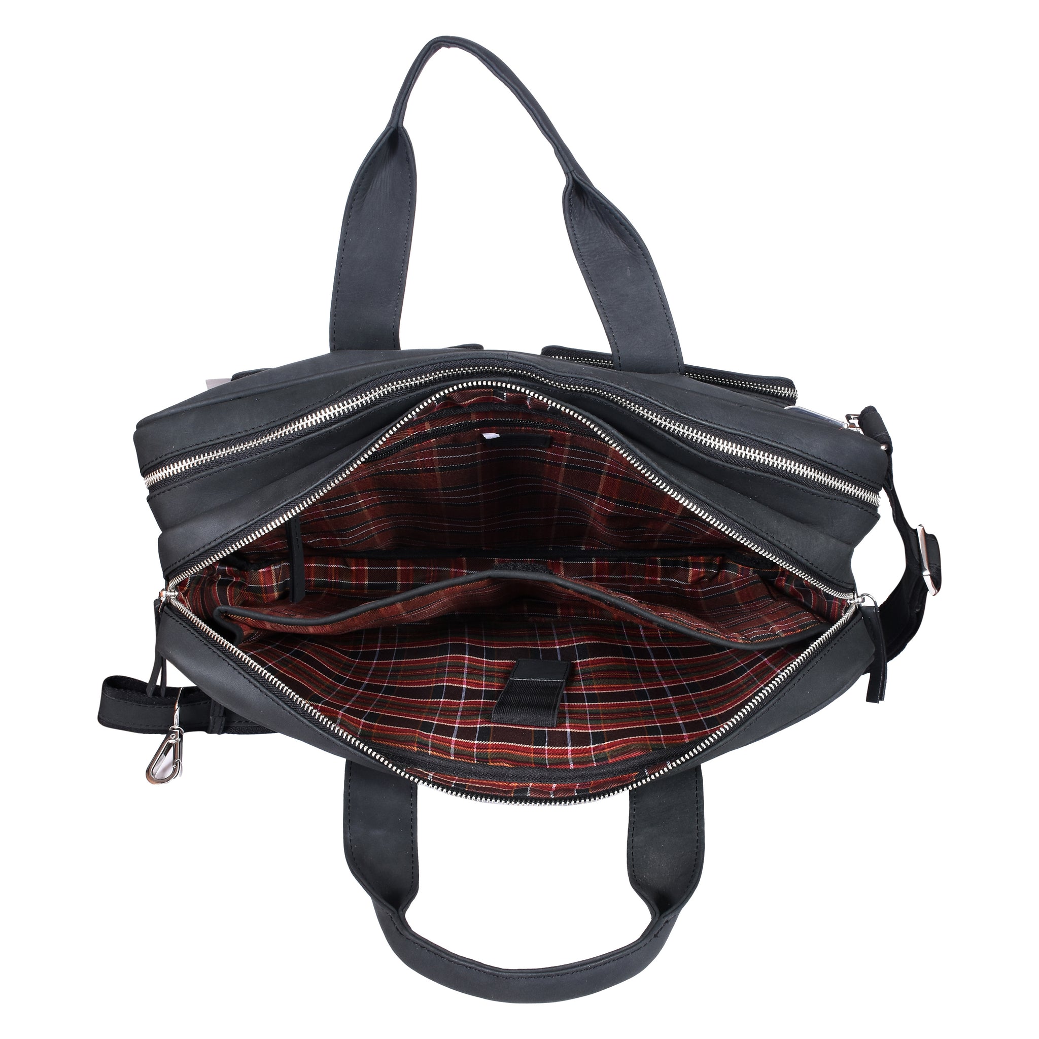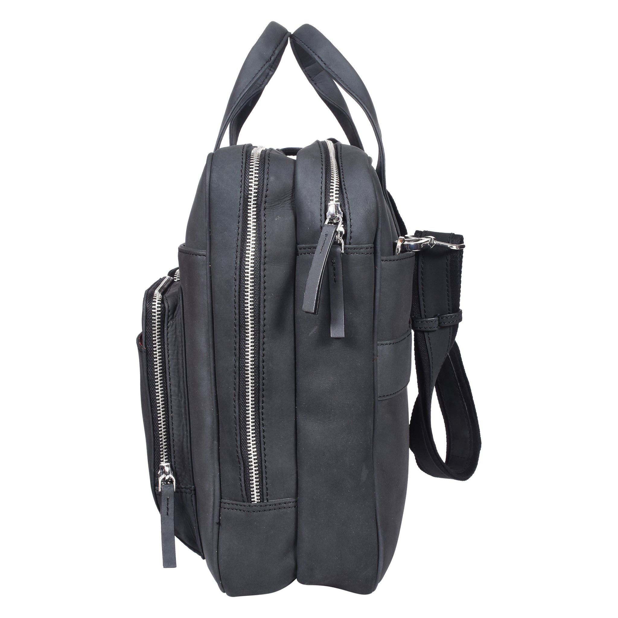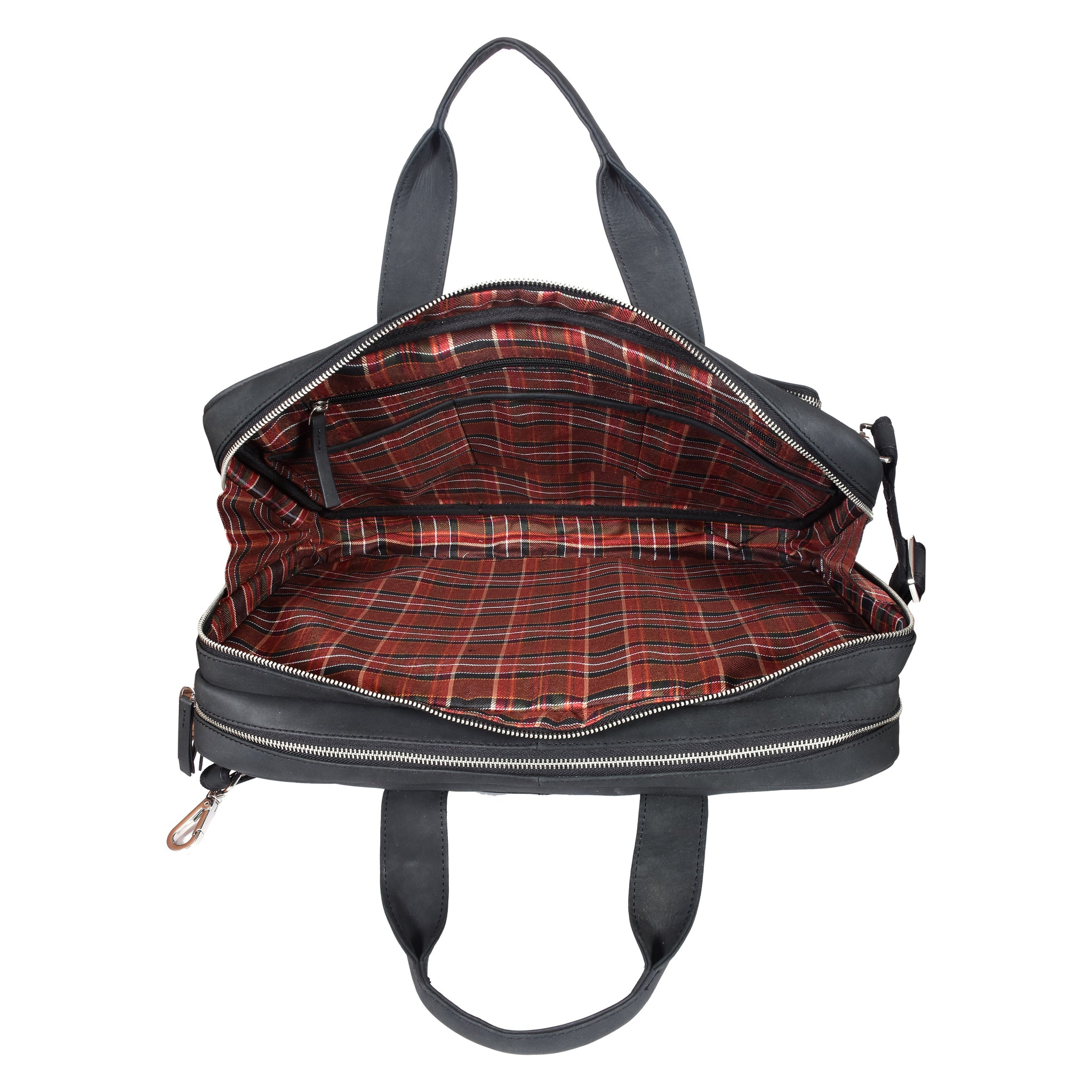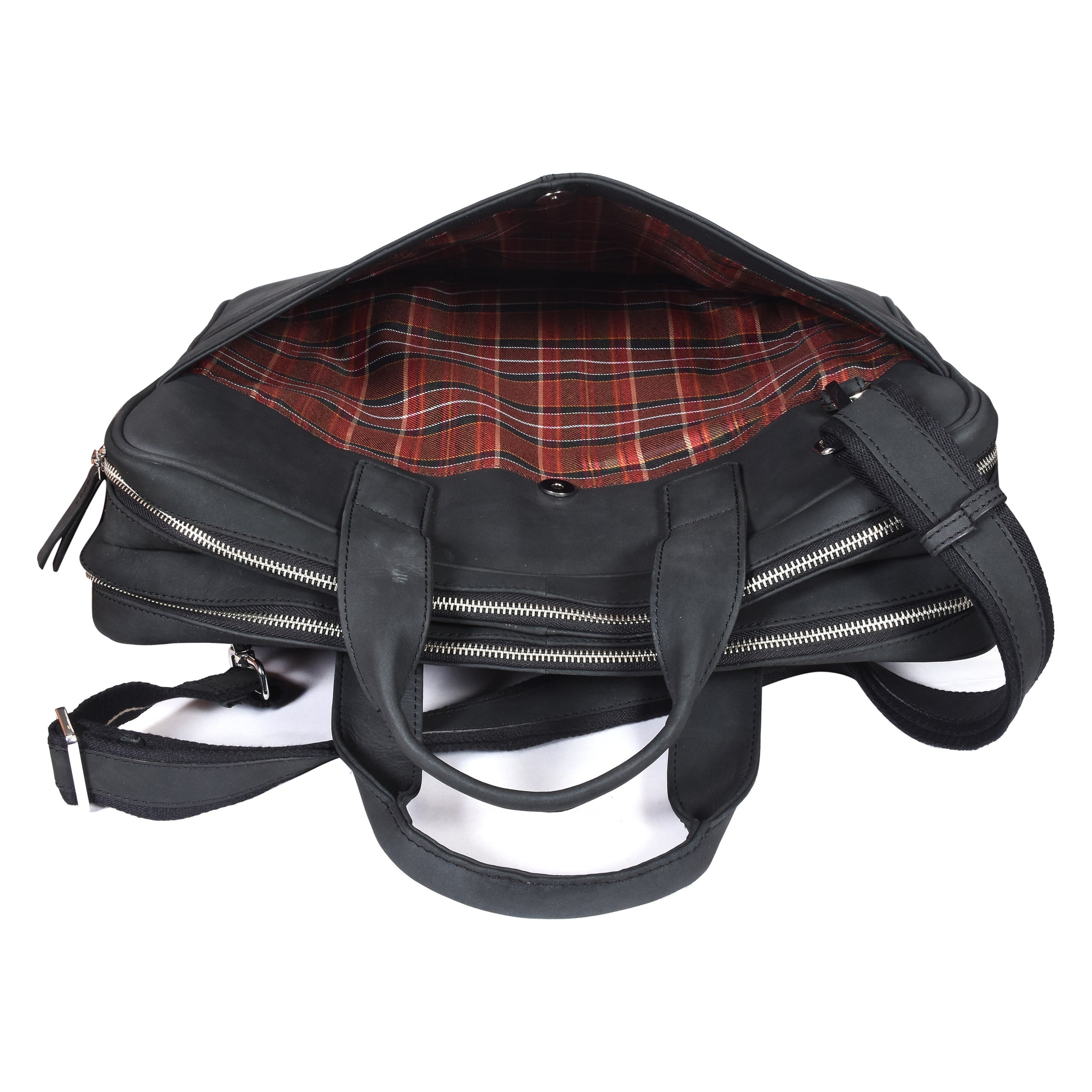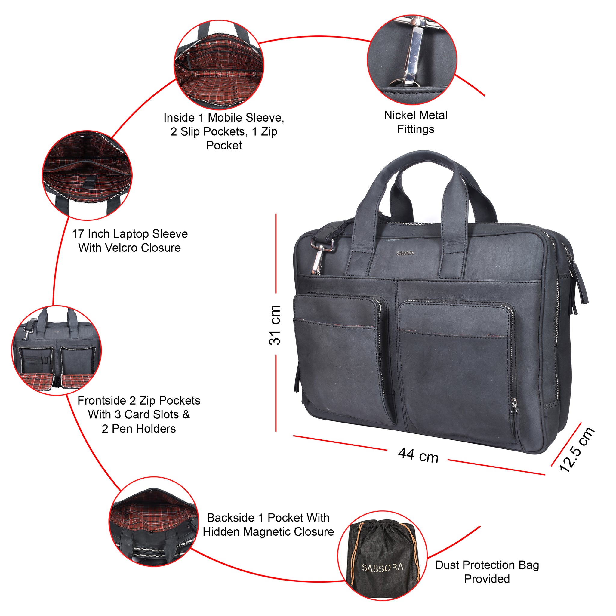 Designed with 2 spacious zip compartments and a 17-inch padded laptop sleeve with Velcro closure, it securely carries your laptop and work essentials. Multiple internal and external pockets help you stay organized, while nickel metal fittings and leather pullers add a premium finish.