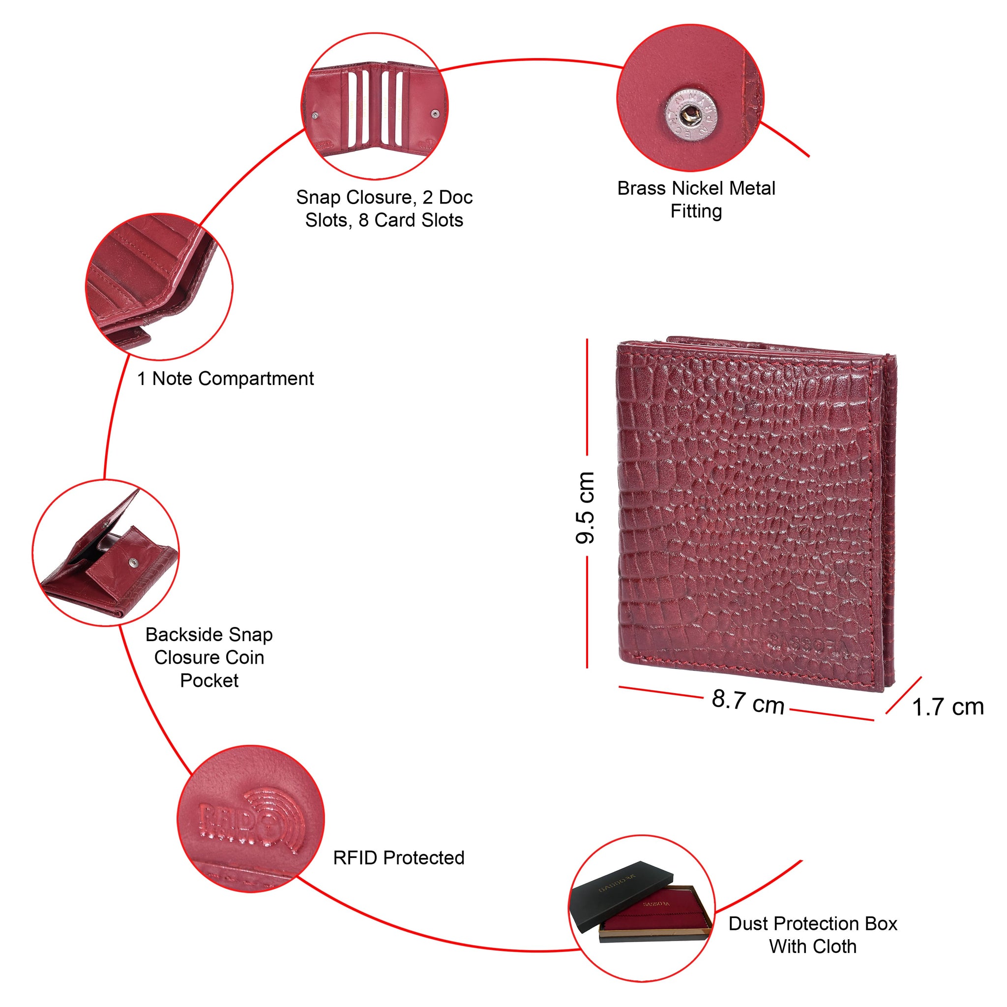 Upgrade your everyday essentials with the Sassora Genuine Leather RFID Blocking Wallet, crafted from premium genuine leather with an elegant croco-texture finish. Designed for durability, style, and practicality, this compact bifold wallet offers multiple card and document slots along with RFID protection to safeguard your cards from unauthorized scanning. Its slim profile makes it ideal for daily use while still providing organized storage for cash, cards, and coins.